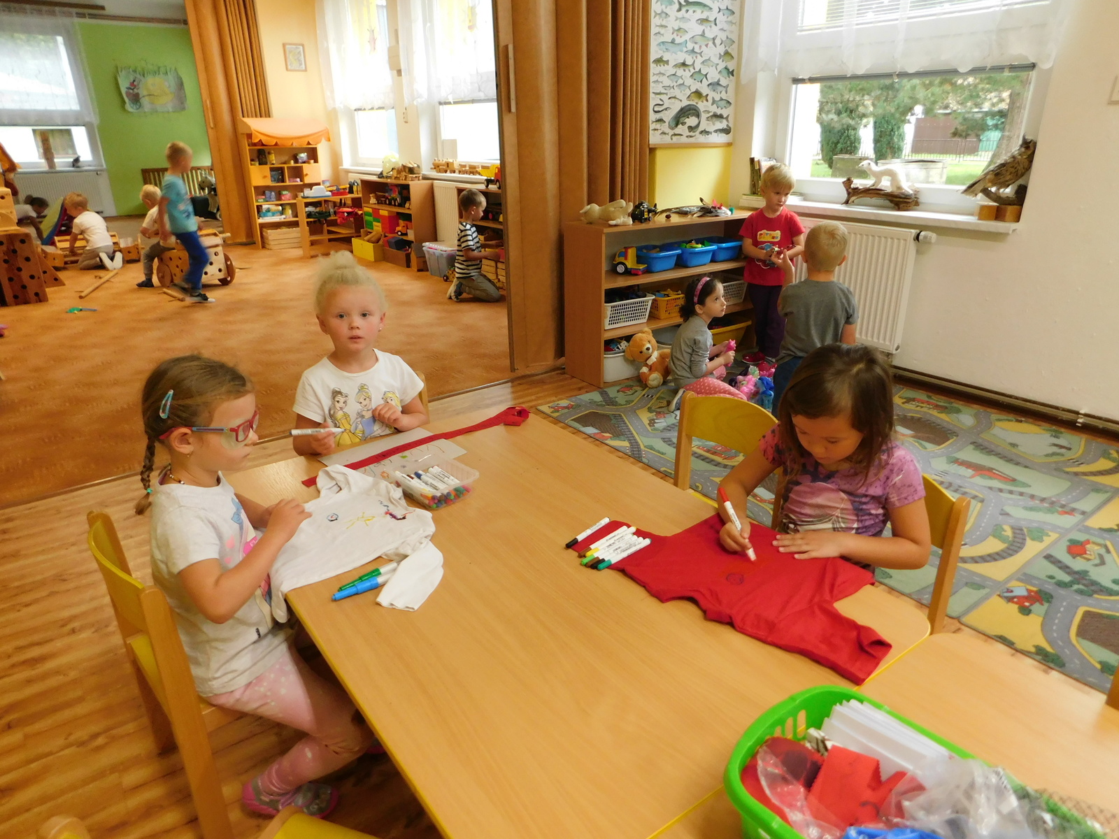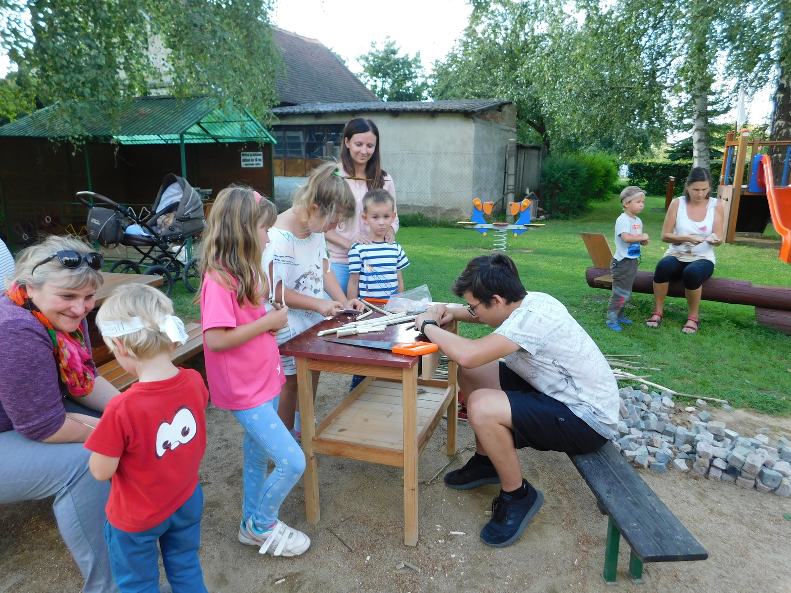 První týden jsme si ve školce,ve třídě Ferdy Mravence, hráli na indiány. Děti se seznámily s životem indiánů, zdobily si trička a čelenky, poznávaly zvířátka, chovaly se jak indiáni - indián je čestný, tichý, pomáhá ostatním, mrštný, pracovitý,..Díky motivaci indiány se děti rychleji zžily s prostředím a pravidly mateřské školky. Lovily zvířata, zpívaly a tancovaly indiánské písně, poznaly děšťovou hůl, totem, teepee, jezdily na koni,..Vyvrcholením týdne bylo v pátek  indiánské odpoledne (komunitně osvětové setkání), kterého se zúčastnily děti ze školky, rodiče, prarodiče, sourozenci dětí, zaměstnaci a přátelé školky. Děti si hrály na indiány - hledaly zlato, házely oštěpem, chytaly ryby, střílely ze vzduchovky, vyráběly píšťalky, malovaly na kameny,,,hrály si a užívaly si odpoledne s kamarády. Dospěláci zakončili indiánské odpoledne povídáním u kávy, nechybělo zhodnocení pořádaných aktivit ve školce a v obci a zájem o plánování dalších.