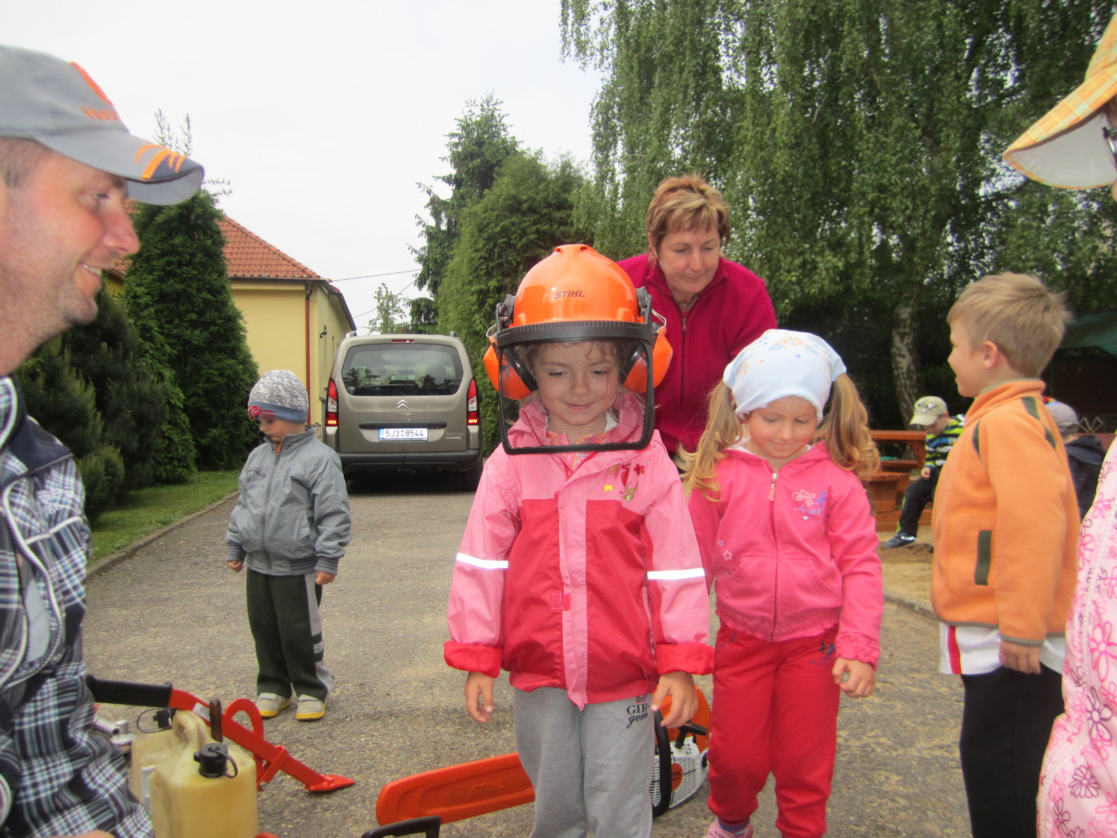 Ve čtvrtek 26.5. k nám do školky přijel tatínek Radečka, aby všem dětem přiblížil, jak se pracuje v lese. Děti viděly, jak se na tuto práci obléká, čím se stromy kácí, měří, jak je důležité vysazovat nové malé stromky. Děti si také potěžkaly pily, vyzkoušely helmu. Všem se povídání a ukázka moc líbila. Děkujeme.