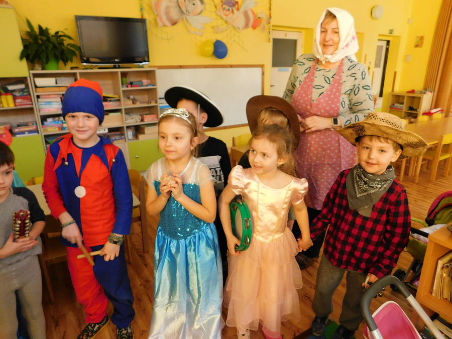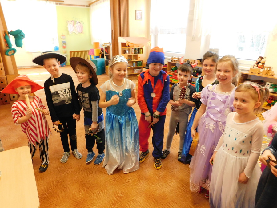 V úterý 1.března jsme se rozloučili s masopustním obdobím - masopustním průvodem po školce. Starší děti se převlékly do kostýmů, rozebraly si hudební nástroje a za zpěvu písní jsme obveselili paní kuchařky, děti a paní učitelky ze třídy Sluníček. Třída starších dětí se proměnila na Jakubov - maškarády navštívily babičky a dědečky a za písničky si vysloužily dobrůtky. Průvod masek došel do kuturního domu (ložnice MŠ), kde nám k tanci zahrála na harmoniku paní Pavlína Roupcová, samozřemě nechybělo porážení kobyly, které si vyzkoušely všechny děti a užili jsme si spoustu legrace.