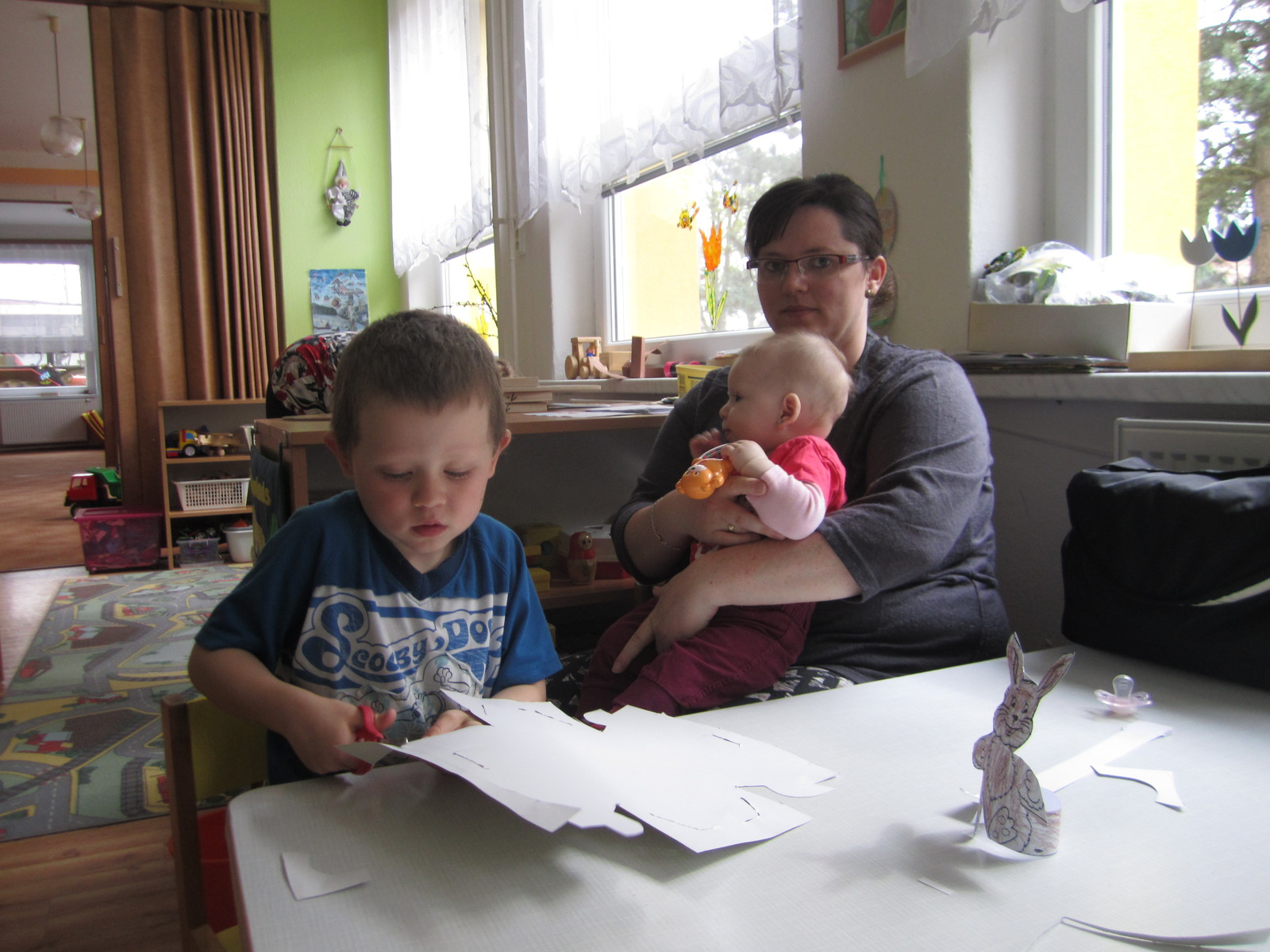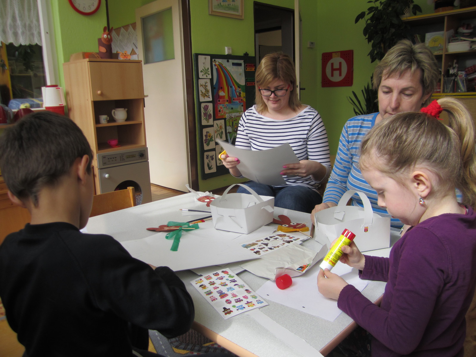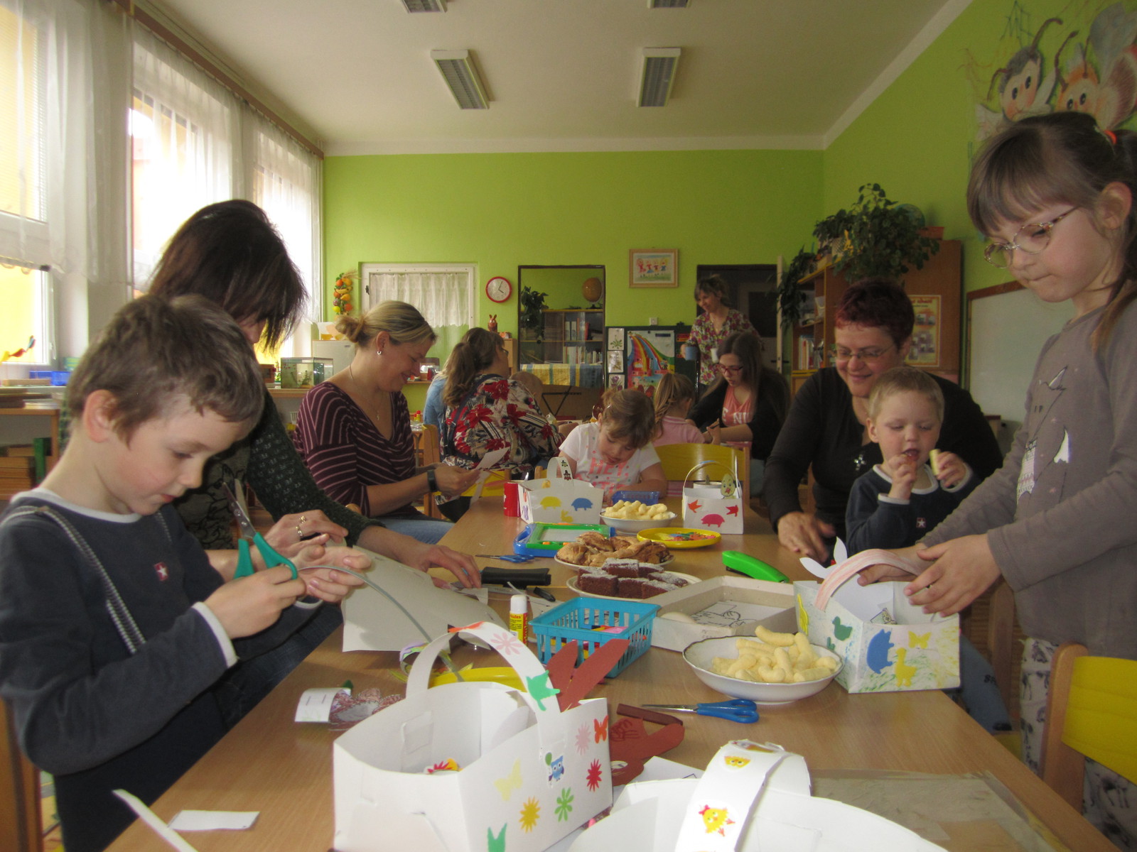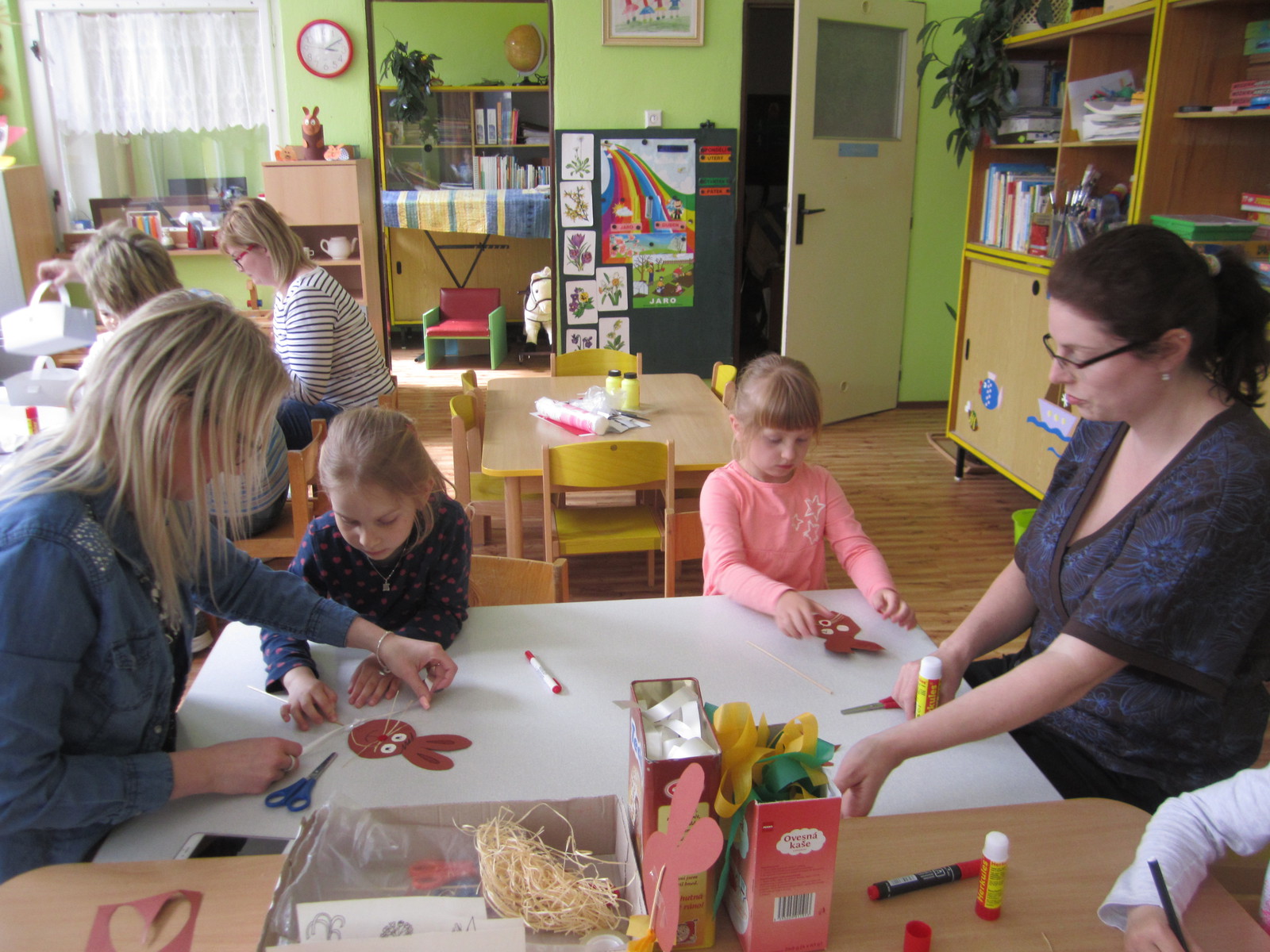 Ve středu odpoledne jsme se ve školce sešli s rodiči dětí na společném velikonočním posezení s vyráběním. Děti s rodiči vystřihovali a zdobili kuřátka, zajíčky, slepičky a velikonoční košík. K příjemnému posezení přispěl šálek kávy a drobné občerstvení. Rodiče si popovídali, prohlédli školku, zahráli si s dětmi.