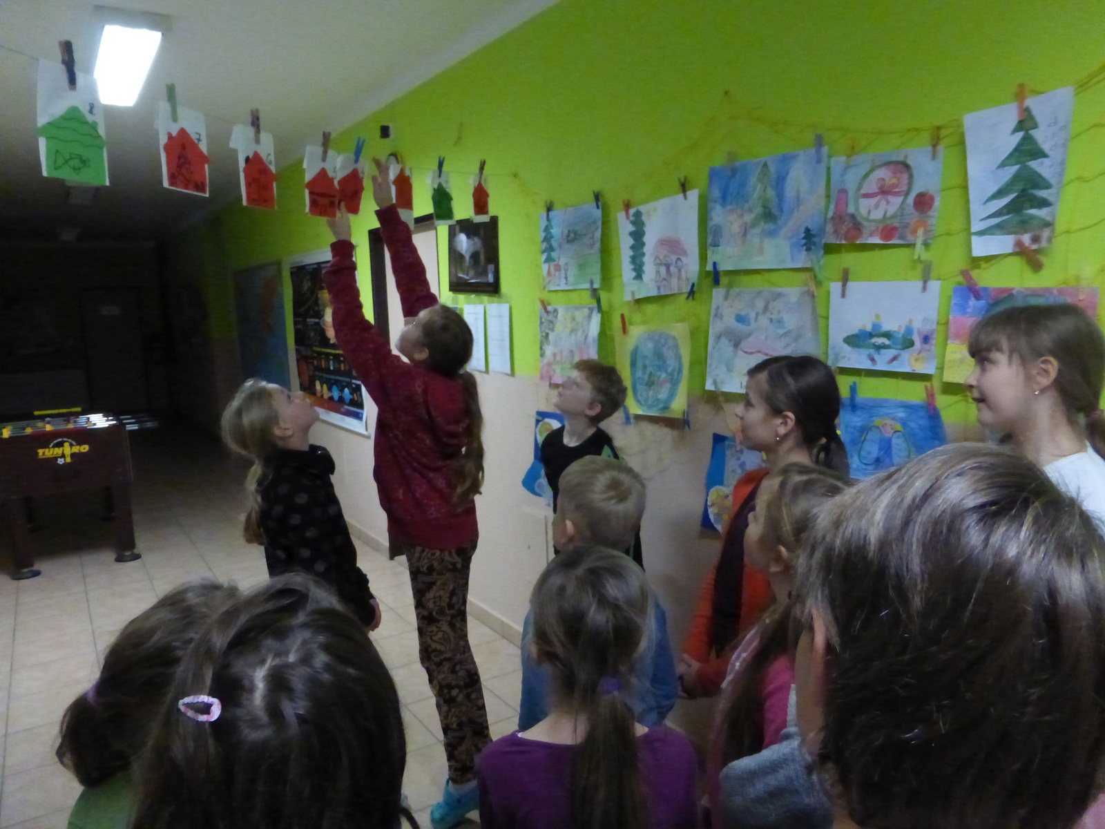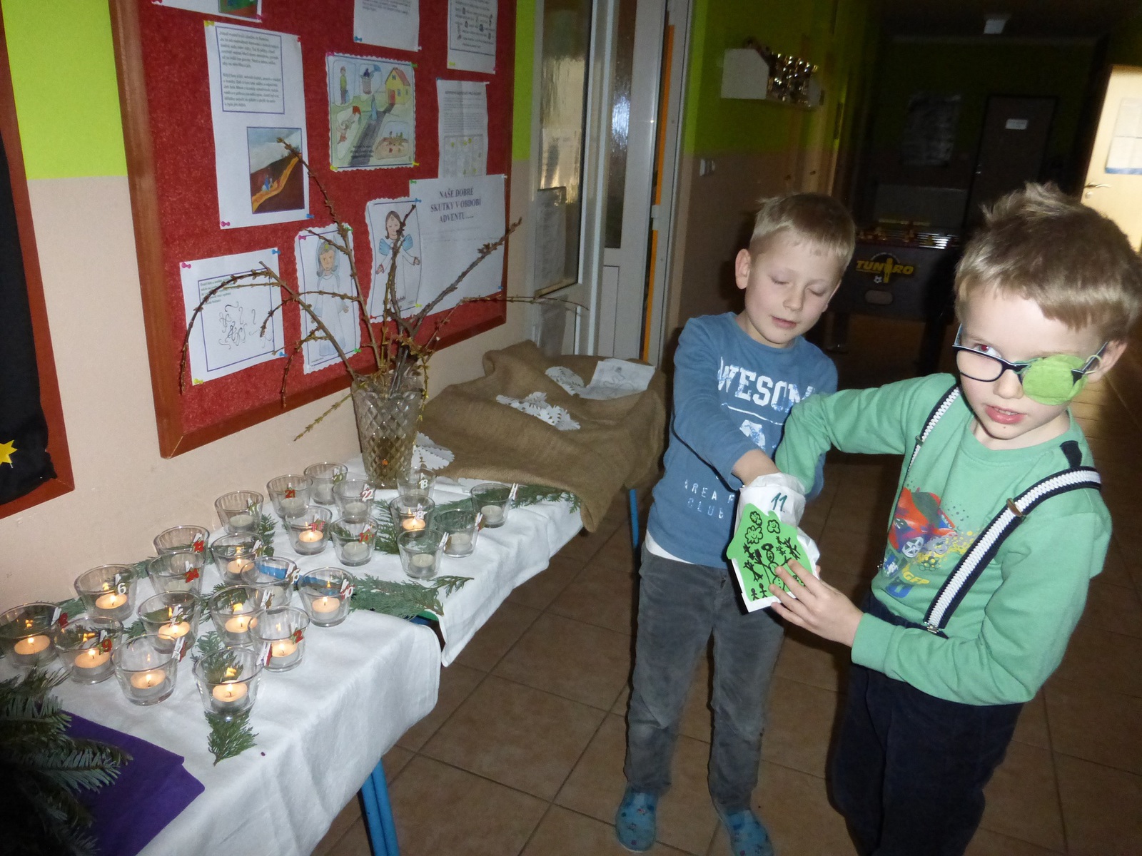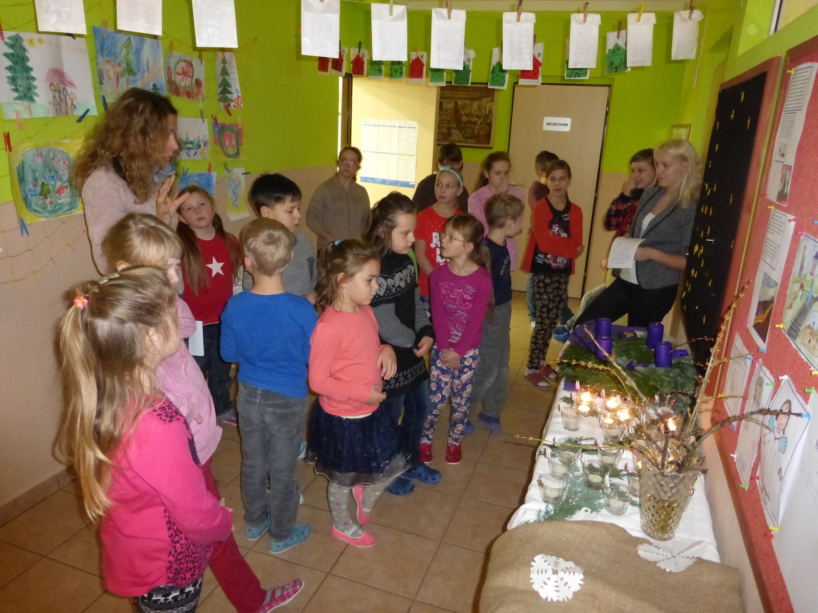 Pro děti nastalo nejkrásnější období roku. Těší se na Vánoce. I my ve škole se jim snažíme toto čekání na Ježíška zpestřit a obohatit. Každý den se setkáváme u adventního věnce, rozsvěcujeme světélka i v adventním kalendáři, plníme úkoly, které na nás čekají v jednotlivých kapsičkách adventního kalendáře. Za splnění úkolů nebo za různé pěkné skutky děti přidělávají hvězdičky na "hvězdnou oblohu".