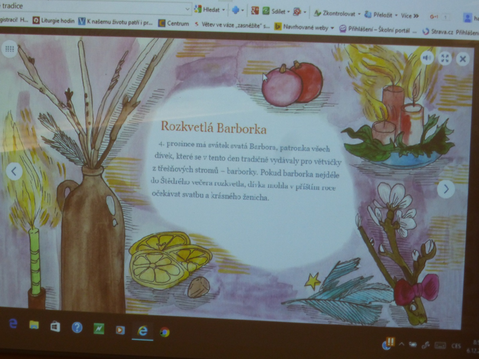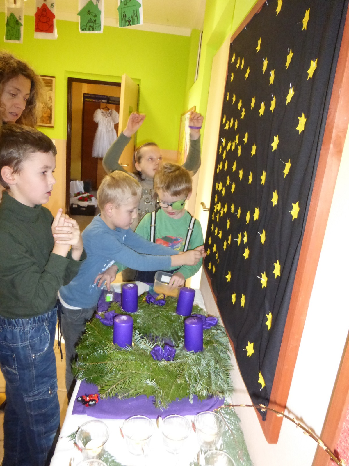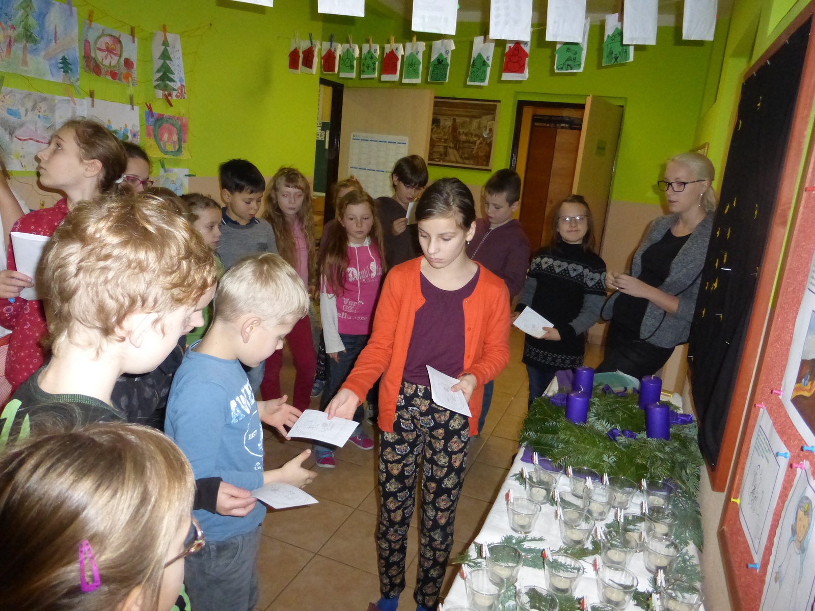 Pro děti nastalo nejkrásnější období roku. Těší se na Vánoce. I my ve škole se jim snažíme toto čekání na Ježíška zpestřit a obohatit. Každý den se setkáváme u adventního věnce, rozsvěcujeme světélka i v adventním kalendáři, plníme úkoly, které na nás čekají v jednotlivých kapsičkách adventního kalendáře. Za splnění úkolů nebo za různé pěkné skutky děti přidělávají hvězdičky na "hvězdnou oblohu".