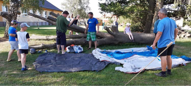 Navečer jsme společně s rodiči postavili stany, opékali párky, zazpívali u táboráku. A v noci se těsně před bouřkou stěhovali do školy. Pak už jsme se učili jen na zahradě podle hesla: Škola hrou, do třídy už nás nedostanou - snad jen při bouřce :) )