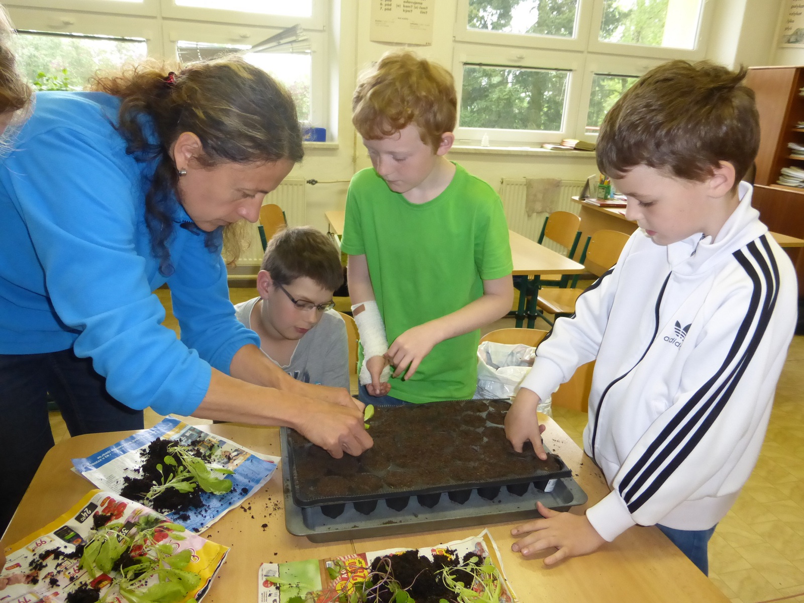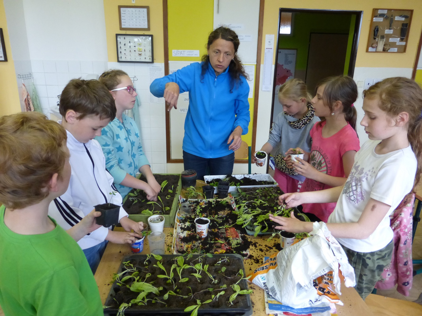 Starší žáci si připravují výsadbu na školní zahradu. Pod vedením paní učitelky se učí pikýrovat sazeničky kedluben, salátu i bylinek, které později vysadí na školní pozemek. Některé bylinky si odnesli u teď s sebou domů, aby si je mohli pěstovat i tam.