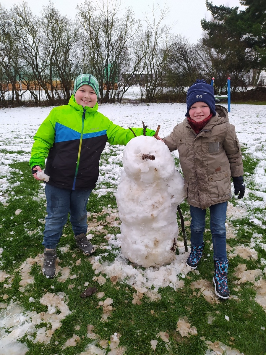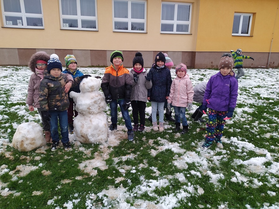 Dnes od rána sněžilo. Žáci byli nedočkaví. Už se těšili na velkou přestávku na koulovačku. Pak jsme zjistili, že se dá postavit sněhulák. Dva sněhuláci nám zdobí školní zahradu.