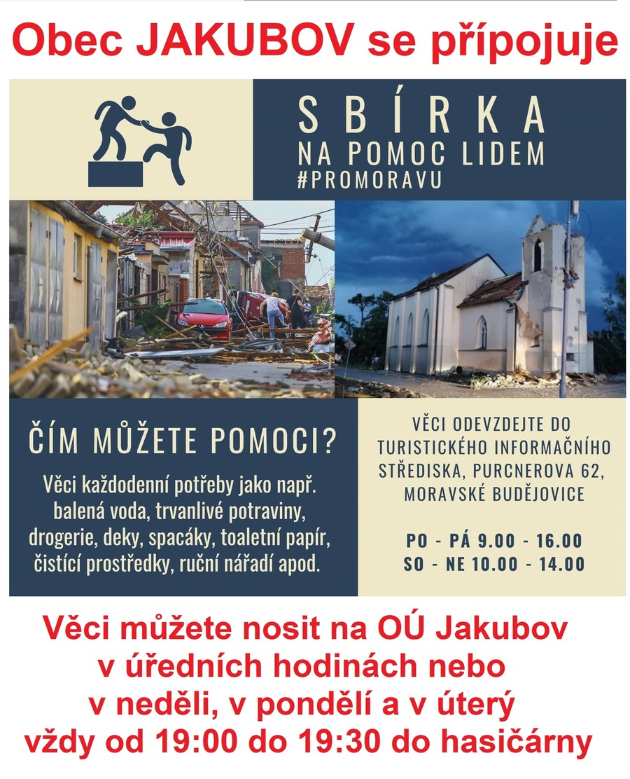 Obec Jakubov společně s Moravskými Budějovicemi organizuje materiální sbírku na pomoc postiženým obcím na jižní Moravě. Nosit můžete: balené vody, trvanlivé potraviny, čistící prostředky, hygienické pomůcky (kartáčky na zuby, vlhčené ubrousky, zubní pasty, dámskou intimní hygienu),), dětem různé brumiky, ovocné kapsičky, hračky pouze nové, hasičům energy drinky, energy tyčinky, sójové tyčinky, (nic čokoládového), plachty, pracovní nářadí, rukavice, deky a staré oblečení. Věci můžete nosit na obecní úřad v úředních hodinách nebo v neděli, v pondělí a v úterý vždy od 19:00 do 19:30 hodin do hasičárny.