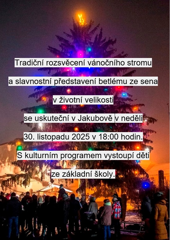 V neděli 30. listopadu 2025 v 18:00 hodin se uskuteční tradiční rozsvěcení vánočního stromu a slavnostní představení již dvacátého prvního betlému ze sena v životní velikosti. S kulturním programem vystoupí děti ze základní školy.