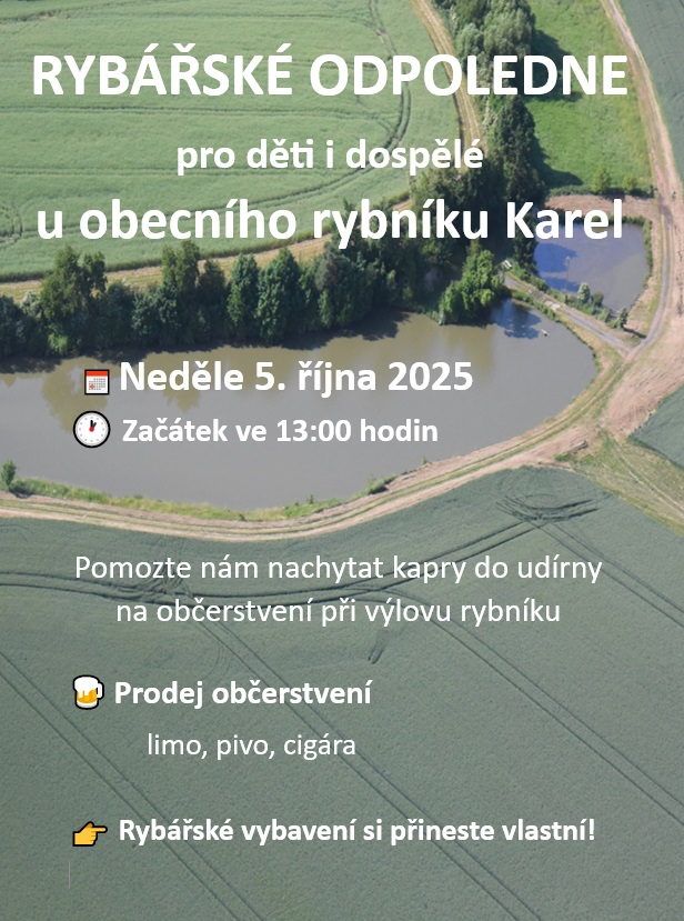 Rybářské odpoledne pro děti i dospělé u obecního rybníku Karel, začátek v neděli 5. října v 13:00 hodin. Přijďte nám pomoci nachytat kapry do udírny na výlov. Prodej drobného občerstvení zajištěn (pivo, limo, cigára). Rybářské vybavení si přineste vlastní.