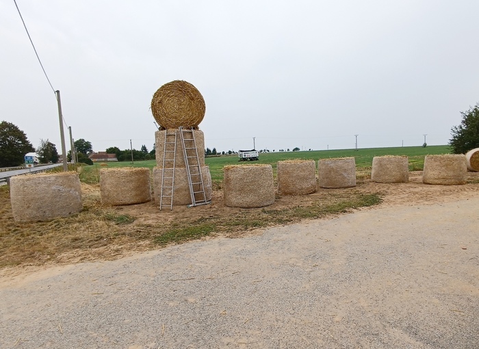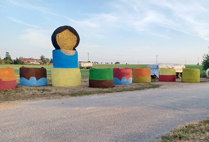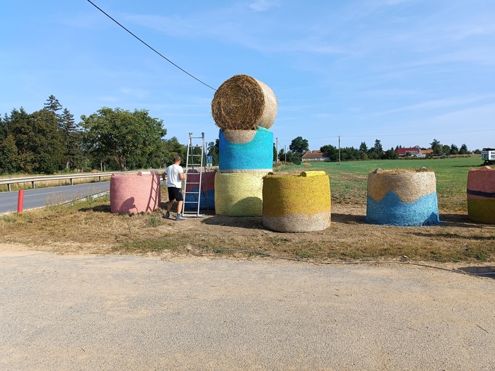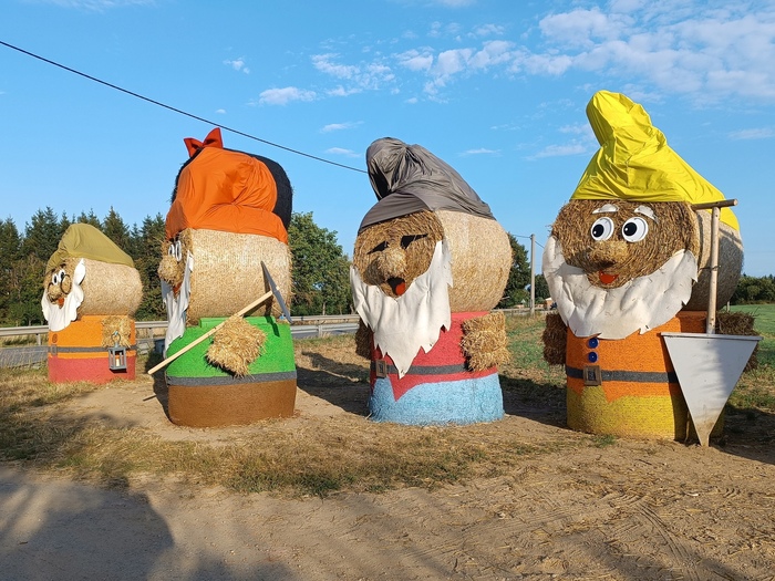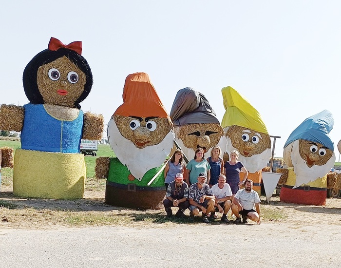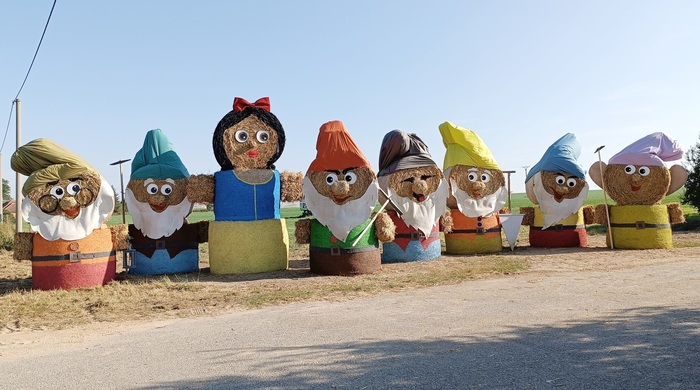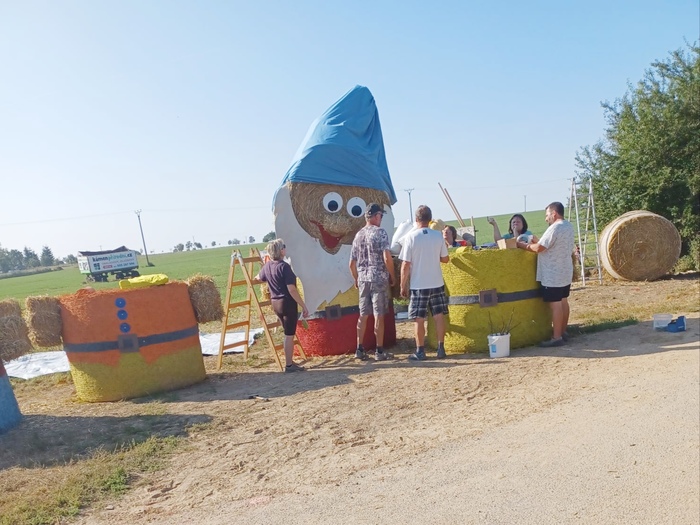 SLAMÁCI LETOS PODVACÁTÉ!!! Ano je to už neuvěřitelných 19 let, co jsme postavili první Slamáky. V roce 2005 jsme vyhráli titul Vesnice roku v Kraji Vysočina a na oslavu našeho vítězství jsme postavili první Slamáky. Inspirovali jsme se v nedalekém Rakousku. To jsme ještě netušili, že jsme založili novou slaměnou tradici. Chtěli jsme toto jubileum oslavit stavbou většího počtu postav. Volba padla na neznámější animovanou pohádku na světě: Sněhurku a sedm trpaslíků. Byla to velká výzva. Proto jsme nenechali nic náhodě a věnovali jsme přípravě doplňků dvě odpoledne. Vlastní stavba trvala tři dny. Jeden den jsme navozili a rozestavěli velké balíky, druhý den jsme stříkali barvy. V sobotu jsme již instalovali hlavy, čepice, vousy a další doplňky. Na stavbu padlo celkem 17 velkých kulatých balíků, 20 malých balíků, velké množství plátna a další pomůcky. Opět jsme zrecyklovali některé nepotřebné věci jako staré koberce, hadice apod. Použili jsme i dva doplňky z minulých slamáků. Při stavění nás mile překvapil pán, který nám přivezl krabici nanuků, abychom se v horku mohli ochladit. Děkujeme.